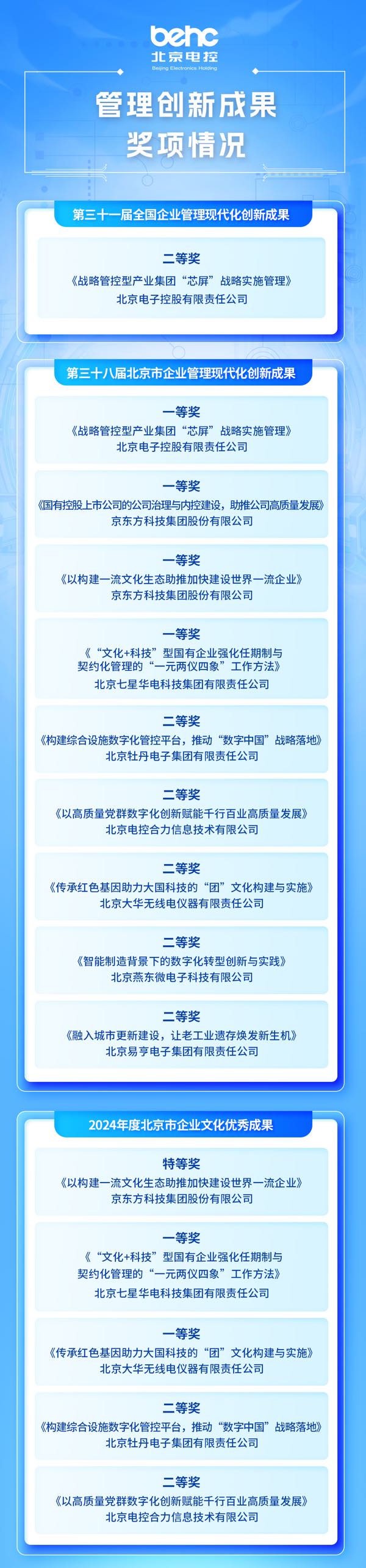 近日,第三十一届全国企业管理现代化创新成果和第三十八届北京市企业管理现代化创新成果名单揭晓,北京电控《战略管控型产业集团“芯屏”战略实施管理》项目荣获全国创新成果二等奖、北京市一等奖。